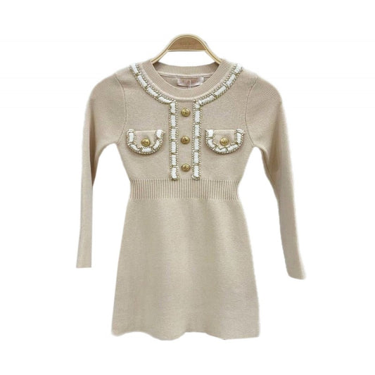 Girl's Long Sleeve Dress- Gold Buttons & Stitching Detail- Black or Beige- Ages 4 to 14