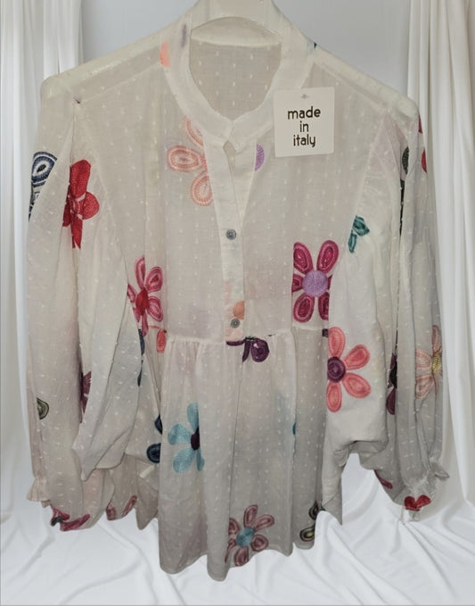 Women's Over Size White Top With Puff Sleeves With Embroided Flowers
